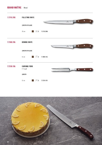 GRAND MAÎTRE Wood 7.7210.20G FILLETING KNIFE LENGTH OF BLADE 20 cm 6 7.7210.20G 7.7300.15G BONING KNIFE LENGTH OF BLADE 15 cm 6 7.7300.15G 7.7230.15G CARVING FORK • Forged LENGTH 15 cm 6 7.7230.15G 86