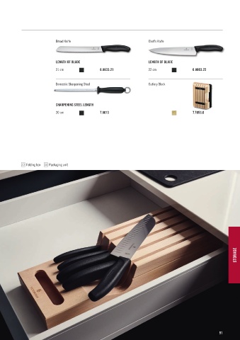 Bread Knife Chef’s Knife LENGTH OF BLADE LENGTH OF BLADE 21 cm 6.8633.21 22 cm 6.8003.22 Domestic Sharpening Steel Cutlery Block SHARPENING STEEL LENGTH 20 cm 7.8013 7.7053.0 Folding box Packaging unit STORAGE 91