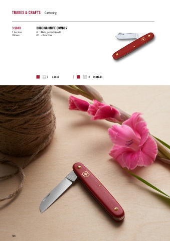 TRADES & CRAFTS Gardening 3.9040 BUDDING KNIFE COMBI S 2 functions 01. Blade, pointed tip with 100 mm 02. – Bark lifter 6 3.9040 10 3.9040.B1 124 | SWISS ARMY KNIVES