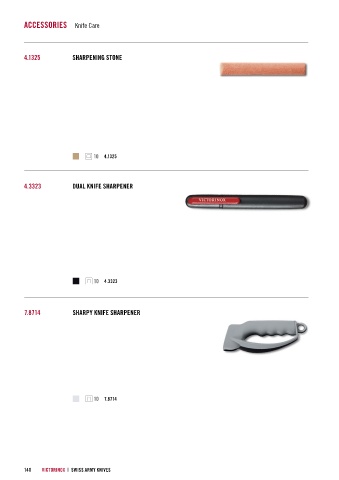 ACCESSORIES Knife Care 4.1325 SHARPENING STONE 10 4.1325 4.3323 DUAL KNIFE SHARPENER 10 4.3323 7.8714 SHARPY KNIFE SHARPENER 10 7.8714 140 VICTORINOX | SWISS ARMY KNIVES