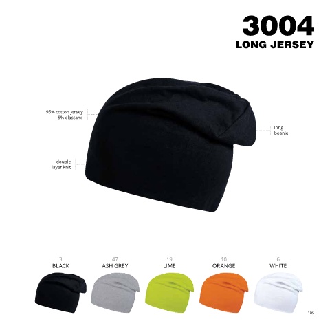 3004 LONG JERSEY 95% cotton jersey 5% elastane long beanie double layer knit 3 47 19 10 6 BLACK ASH GREY LIME ORANGE WHITE LONG JERSEY 95% cotton jersey 3004 long beanie 105 5% elastane double layer knit