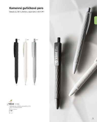 Kamenné guľôčkové pero Skladá sa z 45 % uhličitanu vápenatého a 55 % PP. 103 106 123 Klimt 91769 Guľôčkové pero z uhličitanu vápenatého (45 %) a PP (55 %). Čierny atrament. Ø11 x 140 mm # PDP € 0,48 73
