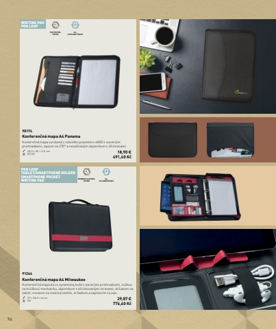 96PEN LOOPTABLET/SMARTPHONE HOLDERSMARTPHONE POCKETWRITING PADWRITING PADPEN LOOPBONDED LEATHER, PAPERA4, 60 LINED PAGESPOLYESTER, PAPERA4, 40 BLANK PAGES91264Konferen%u010dn%u00e1 mapa A4 MilwaukeeKonferen%u010dn%u00e1 mapa A4 zo syntetickej ko%u017ee s viacer%u00fdmi priehradkami, vlo%u017ekou na kr%u00fa%u017ekov%u00fa mechaniku, z%u00e1pisn%u00edkom s 60 linkovan%u00fdmi stranami, dr%u017eiakom na tablet, vreckom na mobiln%u00fd telef%u00f3n, dr%u017eadlom a zap%u00ednan%u00edm na zips.27 %u00d7 36,5 %u00d7 6 cm G3 29,87 %u20ac776,60 K%u010d98174Konferen%u010dn%u00e1 mapa A4 PanamaKonfere%u010dn%u00e1 mapa vyroben%u00e1 z odoln%u00e9ho polyesteru 600D s viacer%u00fdmi priehradkami, zipsom na 270%u00b0 a neza%u0161%u00edvan%u00fdm z%u00e1pisn%u00edkom s 40 stranami.25,5 %u00d7 34 %u00d7 2,5 cm DT,S2 18,90 %u20ac491,40 K%u010d
