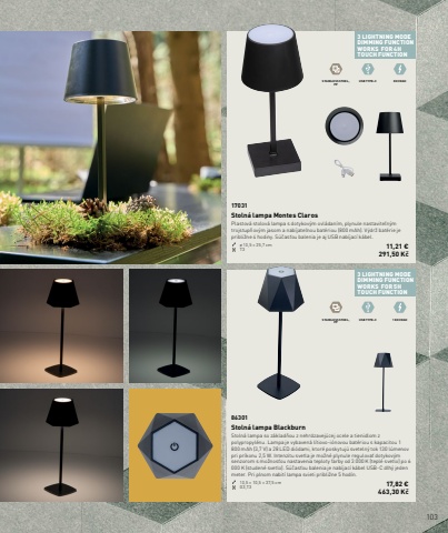 103STAINLESS STEEL, PPUSB TYPE-C 1 800 MAHSTAINLESS STEEL, PPUSB TYPE-C 800 MAH3 LIGHTNING MODEDIMMING FUNCTIONWORKS FOR 4HTOUCH FUNCTION3 LIGHTNING MODEDIMMING FUNCTIONWORKS FOR 5HTOUCH FUNCTION17031Stoln%u00e1 lampa Montes ClarosPlastov%u00e1 stolov%u00e1 lampa s dotykov%u00fdm ovl%u00e1dan%u00edm, plynule nastavite%u013en%u00fdm trojstup%u0148ov%u00fdm jasom a nab%u00edjate%u013enou bat%u00e9riou (800 mAh). V%u00fddr%u017e bat%u00e9rie je pribli%u017ene 4 hodiny. S%u00fa%u010das%u0165ou balenia je aj USB nab%u00edjac%u00ed k%u00e1bel.%u00f8 10,5 %u00d7 25,7 cm T3 11,21 %u20ac291,50 K%u010d86301Stoln%u00e1 lampa BlackburnStoln%u00e1 lampa so z%u00e1klad%u0148ou z nehrdzavej%u00facej ocele a tienidlom z polypropyl%u00e9nu. Lampa je vybaven%u00e1 l%u00edtiovo-i%u00f3novou bat%u00e9riou s kapacitou 1 800 mAh (3,7 V) a 28 LED di%u00f3dami, ktor%u00e9 poskytuj%u00fa sveteln%u00fd tok 130 l%u00famenov pri pr%u00edkonu 2,5 W. Intenzitu svetla je mo%u017en%u00e9 plynule regulova%u0165 dotykov%u00fdm senzorom s mo%u017enos%u0165ou nastavenia teploty farby od 3 000 K (tepl%u00e9 svetlo) po 6 000 K (studen%u00e9 svetlo). S%u00fa%u010das%u0165ou balenia je nab%u00edjac%u00ed k%u00e1bel USB-C dlh%u00fd jeden meter. Pri plnom nabit%u00ed lampa svieti pribli%u017ene 5 hod%u00edn.10,5 %u00d7 10,5 %u00d7 37,5 cmG3,T3 17,82 %u20ac463,30 K%u010d