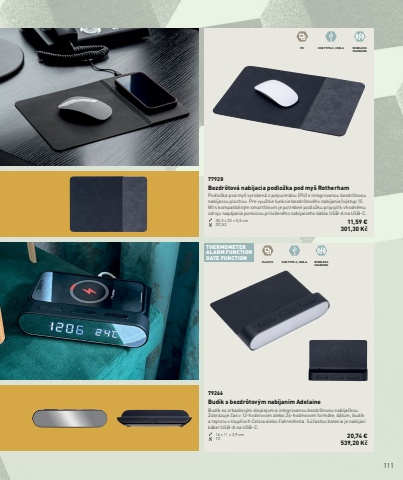 111PU USB TYPE-C, USB-A WIRELESSCHARGINGPLASTIC USB TYPE-C, USB-A WIRELESSCHARGINGTHERMOMETERALARM FUNCTIONDATE FUNCTION77928Bezdr%u00f4tov%u00e1 nab%u00edjacia podlo%u017eka pod my%u0161 RotherhamPodlo%u017eka pod my%u0161 vyroben%u00e1 z polyuret%u00e1nu (PU) s integrovanou bezdr%u00f4tovou nab%u00edjacou plochou. Pre vyu%u017eitie funkcie bezdr%u00f4tov%u00e9ho nab%u00edjania (v%u00fdstup 15 W) s kompatibiln%u00fdm smartf%u00f3nom je potrebn%u00e9 podlo%u017eku pripoji%u0165 k vhodn%u00e9mu zdroju nap%u00e1jania pomocou prilo%u017een%u00e9ho nab%u00edjacieho k%u00e1bla USB-A na USB-C.30,3 %u00d7 22 %u00d7 0,5 cm DT,S2 11,59 %u20ac301,30 K%u010d79266Bud%u00edk s bezdr%u00f4tov%u00fdm nab%u00edjan%u00edm AdelaineBud%u00edk so zrkadlov%u00fdm displejom a integrovanou bezdr%u00f4tovou nab%u00edja%u010dkou. Zobrazuje %u010das v 12-hodinovom alebo 24-hodinovom form%u00e1te, d%u00e1tum, bud%u00edk a teplotu v stup%u0148och Celzia alebo Fahrenheita. S%u00fa%u010das%u0165ou balenia je nab%u00edjac%u00ed k%u00e1bel USB-A na USB-C.16 %u00d7 11 %u00d7 3,9 cm T3 20,74 %u20ac539,20 K%u010d