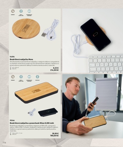 116BAMBOO USB-A, MICRO-USB5W WIRELESS CHARGINGBAMBOO USB-A, MICRO-USB5W WIRELESS CHARGING8000 MAH95366Bezdr%u00f4tov%u00e1 nab%u00edja%u010dka a powerbank Milan 8,000 mAhBezdr%u00f4tov%u00e1 nab%u00edja%u010dka a powerbank s kapacitou 8 000 mAh, v%u00fdstupom 5 wattov, USB a USB-C vstupmi, dod%u00e1van%u00e1 s bambusov%u00fdm nab%u00edjac%u00edm k%u00e1blom. Ka%u017ed%u00fd kus a grav%u00edrovanie je jedine%u010dn%u00e9 v%u010faka pr%u00edrodn%u00e9mu bambusov%u00e9mu materi%u00e1lu.13,6 %u00d7 6,8 %u00d7 1,1 cm CG3,T3 30,00 %u20ac 780,00 K%u010d54254Bezdr%u00f4tov%u00e1 nab%u00edja%u010dka MonsOkr%u00fahla bambusov%u00e1 bezdr%u00f4tov%u00e1 nab%u00edja%u010dka s nab%u00edjac%u00edm k%u00e1blom, kompatibiln%u00e1 so v%u0161etk%u00fdmi smartf%u00f3nmi podporuj%u00facimi QI bezdr%u00f4tov%u00e9 nab%u00edjanie. Ka%u017ed%u00fd kus a grav%u00edrovanie je jedine%u010dn%u00e9 v%u010faka pr%u00edrodn%u00e9mu bambusov%u00e9mu materi%u00e1lu.%u00f8 9 %u00d7 0,8 cm CG2,T2 8,23 %u20ac 214,00 K%u010d