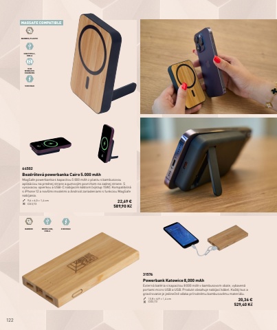 122BAMBOO, PLASTICUSB TYPE-C,USB-A15 W WIRELESSCHARGING5 000 MAHMAGSAFE COMPATIBLEBAMBOO MICRO-USB,USB-A8 000 MAH31576Powerbank Katowice 8,000 mAhExtern%u00e1 bat%u00e9ria s kapacitou 8 000 mAh v bambusovom obale, vybaven%u00e1 portami micro USB a USB. Produkt obsahuje nab%u00edjac%u00ed k%u00e1bel. Ka%u017ed%u00fd kus a grav%u00edrovanie je jedine%u010dn%u00e9 v%u010faka pr%u00edrodn%u00e9mu bambusov%u00e9mu materi%u00e1lu.13,8 %u00d7 6,9 %u00d7 1,4 cm CG3,T3 20,36 %u20ac 529,40 K%u010d64502Bezdr%u00f4tov%u00e1 powerbanka Cairo 5.000 mAhMagSafe powerbanka s kapacitou 5 000 mAh z plastu s bambusovou aplik%u00e1ciou na prednej strane a gumov%u00fdm povrchom na zadnej strane. S vys%u00favacou opierkou a USB-C nab%u00edjac%u00edm k%u00e1blom (v%u00fdstup 15W). Kompatibiln%u00e1 s iPhone 12 a nov%u0161%u00edmi modelmi a Android zariadeniami s funkciou MagSafe nab%u00edjania.9,6 %u00d7 6,5 %u00d7 1,4 cm CG3,T3 22,69 %u20ac589,90 K%u010d