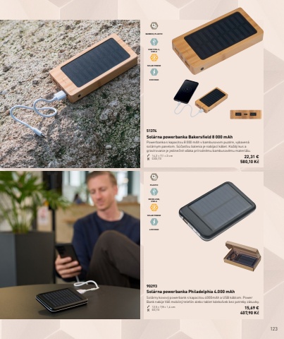 123BAMBOO, PLASTICUSB TYPE-C,USB-ASOLAR POWER8 000 MAHPLASTICMICRO-USB,USB-ASOLAR POWER4 000 MAH51374Sol%u00e1rna powerbanka Bakersfield 8 000 mAhPowerbanka s kapacitou 8 000 mAh v bambusovom puzdre, vybaven%u00e1 sol%u00e1rnym panelom. S%u00fa%u010das%u0165ou balenia je nab%u00edjac%u00ed k%u00e1bel. Ka%u017ed%u00fd kus a grav%u00edrovanie je jedine%u010dn%u00e9 v%u010faka pr%u00edrodn%u00e9mu bambusov%u00e9mu materi%u00e1lu.14,2 %u00d7 7,1 %u00d7 2 cm CG3,T3 22,31 %u20ac580,10 K%u010d90293Sol%u00e1rna powerbanka Philadelphia 4.000 mAhSol%u00e1rny kovov%u00fd powerbank s kapacitou 4000mAh a USB k%u00e1blom. Power Bank nabije V%u00e1%u0161 mobiln%u00fd telef%u00f3n alebo tablet kdeko%u013evek bez potreby z%u00e1suvky.12,5 %u00d7 7,8 %u00d7 1,4 cm G3,T3 15,69 %u20ac407,90 K%u010d