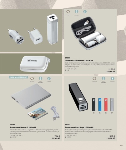 12703 04 05 07ALUMINIUM USB-A, USB TYPE-CPLASTIC USB-A, 2 200 MAHUSB TYPE-C2 200 MAHABS, PU USB-A,USB TYPE-C2 200 MAHCMYK ALLOVER PRINT39533Cestovn%u00e1 sada Exeter 2200 mAhSada obsahuje extern%u00fa plastov%u00fa powerbanku s kapacitou 2 200 mAh, sie%u0165ov%u00fd adapt%u00e9r, USB nab%u00edja%u010dku a USB adapt%u00e9r do auta, v%u0161etko pekne usporiadan%u00e9 v kompaktnom p%u00fazdre.11,7 %u00d7 8,1 %u00d7 3,8 cm T2 12,33 %u20ac320,60 K%u010d16382Powerbank Mostar 2.200 mAhPlastov%u00e1 extern%u00e1 bat%u00e9ria s kapacitou 2 200 mAh a USB pripojen%u00edm, ktor%u00e1 umo%u017e%u0148uje nab%u00edja%u0165 smartf%u00f3n alebo tablet aj na cest%u00e1ch. S%u00fa%u010das%u0165ou balenia je micro USB k%u00e1bel.11,9 %u00d7 6,7 %u00d7 0,9 cm UV,T2 7,36 %u20ac191,40 K%u010d68624Powerbank Port Hope 2.200mAhTento jednoducho pou%u017eite%u013en%u00fd kovov%u00fd Power Bank s kapaciotu 2200 mAh zachr%u00e1ni V%u00e1%u0161 smartf%u00f3n v n%u00fadzovom pr%u00edpade. Osobitne balen%u00e9 v krabici, vr%u00e1tane USB k%u00e1bla.9,5 %u00d7 2,2 %u00d7 2,1 cm G2,T2 5,15 %u20ac133,90 K%u010d