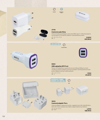 130LED LIGHTINGABSPLASTIC, METALPLASTIC USB TYPE-C,USB-AAUSTRALIA, CHINA, EUROPE, UK AND USA85803USB nab%u00edja%u010dka KFZ Fruit%u0160t%u00fdlov%u00e1 12V nab%u00edja%u010dka do zapa%u013eova%u010da do auta. M%u00e1 dva USB porty, ktor%u00e9 umo%u017e%u0148uj%u00fa s%u00fa%u010dasn%u00e9 nab%u00edjanie viacer%u00fdch zariaden%u00ed. Farebn%u00fd plastov%u00fd kr%u00fa%u017eok po%u010das nab%u00edjania svieti pre v%u00e4%u010d%u0161ie pohodlie.7 %u00d7 2,7 %u00d7 3,1 cm T2 1,90 %u20ac49,40 K%u010d27798Cestovn%u00e1 sada ChinyCestovn%u00e1 sada pozost%u00e1vaj%u00faca z koncovky USB a typu C, mo%u017enos%u0165 pripojenia na sie%u0165 alebo do 12V z%u00e1str%u010dky. Balen%u00e9 v uzatv%u00e1rate%u013enom puzdre.10,5 %u00d7 5,5 %u00d7 4,7 cm T2 13,05 %u20ac339,30 K%u010d98390Cestovn%u00fd adapt%u00e9r PeruCestovn%u00fd adapt%u00e9r v plastovom kufr%u00edku s adapt%u00e9rmi pre USA, Ve%u013ek%u00fa Brit%u00e1niu, AUS a EU. Svoje zariadenie tak m%u00f4%u017eete nab%u00edja%u0165 v%u0161ade bez probl%u00e9mov.6,2 %u00d7 5,9 %u00d7 4,6 cm T2,UV 4,95 %u20ac128,70 K%u010d