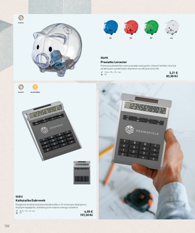 13204 05 09 66PLASTICPLASTIC SOLAR POWER05690Prasiatko LeicesterPlastov%u00e1 pokladni%u010dka tvare prasiatka dostupn%u00e1 v r%u00f4znych farb%u00e1ch, ktor%u00e1 je atrakt%u00edvnym a praktick%u00fdm doplnkom na v%u00e1%u0161 pracovn%u00fd st%u00f4l.12,6 %u00d7 10 %u00d7 10,1 cm T2 3,21 %u20ac83,50 K%u010d50812Kalkula%u010dka DubrovnikElegantn%u00e1 strieborn%u00e1 plastov%u00e1 kalkula%u010dka s 12-miestnym displejom a dvojit%u00fdm nap%u00e1jan%u00edm, kombinuj%u00facim sol%u00e1rnu energiu a bat%u00e9rie.16,5 %u00d7 12 %u00d7 2,1 cm T2 6,05 %u20ac 157,30 K%u010d