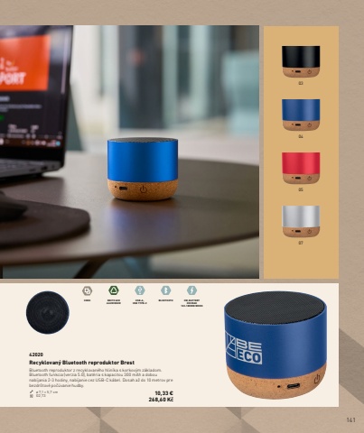 14107050403CORK RECYCLED ALUMINIUMUSB-A, USB TYPE-CBLUETOOTH 3W, BATTERY 300 MAH120-180MIN WORK42020Recyklovan%u00fd Bluetooth reproduktor BrestBluetooth reproduktor z recyklovan%u00e9ho hlin%u00edka s korkov%u00fdm z%u00e1kladom. Bluetooth funkcia (verzia 5.0), bat%u00e9ria s kapacitou 300 mAh a dobou nab%u00edjania 2-3 hodiny, nab%u00edjanie cez USB-C k%u00e1bel. Dosah a%u017e do 10 metrov pre bezdr%u00f4tov%u00e9 po%u010d%u00favanie hudby.%u00f8 7,1 %u00d7 5,7 cm G2,T3 10,33 %u20ac268,60 K%u010d