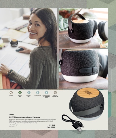 143BAMBOO RECYCLED PETUSB TYPE-C, USB-ABLUETOOTH 10M BATTERY 1 200 MAH, 60-120 MINUTES WORKWIRELESSCHARGING 15W39983RPET Bluetooth reproduktor PiacenzaBluetooth reproduktor (5 Watt, bat%u00e9ria: 1 200 mAh) vyroben%u00fd z recyklovan%u00e9ho PET, s bambusovou bezdr%u00f4tovou induk%u010dnou nab%u00edjacou plochou (15 Watt). S%u00fa%u010das%u0165ou je USB-C nab%u00edjac%u00ed k%u00e1bel (cca 50 cm).%u00f8 10,2 %u00d7 8,2 cm CG3,T3 21,54 %u20ac560,00 K%u010d