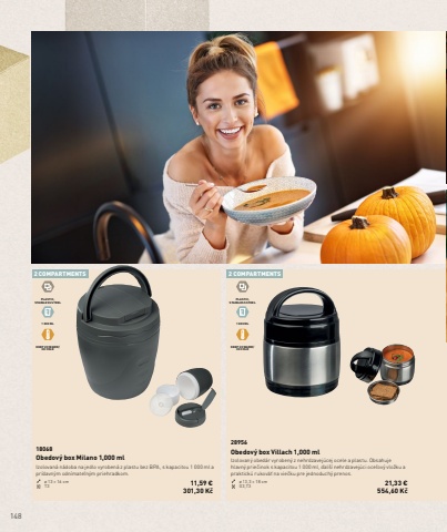 148PLASTIC, STAINLESS STEEL1 000 MLKEEP 2H WARM/3H COLDPLASTIC, STAINLESS STEEL1 000 MLKEEP 2H WARM/3H COLD2 COMPARTMENTS 2 COMPARTMENTS28956Obedov%u00fd box Villach 1,000 mlIzolovan%u00fd obed%u00e1r vyroben%u00fd z nehrdzavej%u00facej ocele a plastu. Obsahuje hlavn%u00fd prie%u010dinok s kapacitou 1 000 ml, %u010fal%u0161%u00ed nehrdzavej%u00faci oce%u013eov%u00fd vlo%u017eku a praktick%u00fa rukov%u00e4%u0165 na vie%u010dku pre jednoduch%u00fd prenos.%u00f8 13,3 %u00d7 18 cm G3,T3 21,33 %u20ac554,60 K%u010d18068Obedov%u00fd box Milano 1,000 mlIzolovan%u00e1 n%u00e1doba na jedlo vyroben%u00e1 z plastu bez BPA, s kapacitou 1 000 ml a pr%u00eddavn%u00fdm odn%u00edmate%u013en%u00fdm priehradkom.%u00f8 13 %u00d7 16 cm T3 11,59 %u20ac301,30 K%u010d