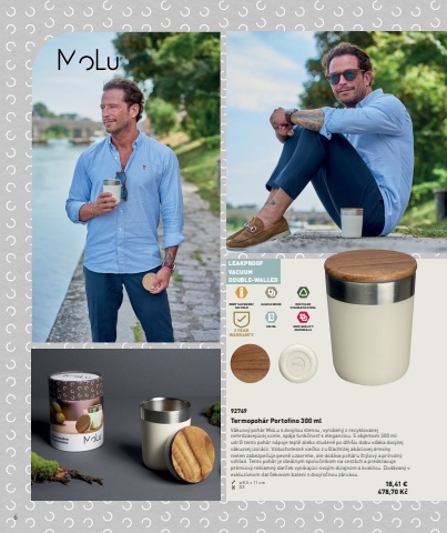 6LEAKPROOFVACUUMDOUBLE-WALLED KEEP 14H WARM/16H COLDACACIA WOOD RECYCLED STAINLESS STEEL300 ML HIGH QUALITY 2 YEAR MATERIALSWARRANTY92769Termopoh%u00e1r Portofino 300 mlV%u00e1kuov%u00fd poh%u00e1r MoLu s dvojitou stenou, vyroben%u00fd z recyklovanej nehrdzavej%u00facej ocele, sp%u00e1ja funk%u010dnos%u0165 s eleganciou. S objemom 300 ml udr%u017e%u00ed tento poh%u00e1r n%u00e1poje tepl%u00e9 alebo studen%u00e9 po dlh%u0161iu dobu v%u010faka dvojitej v%u00e1kuovej izol%u00e1cii. Vzduchotesn%u00e9 vie%u010dko z u%u0161%u013eachtilej ak%u00e1ciovej dreviny nielen zabezpe%u010duje pevn%u00e9 uzavretie, ale dod%u00e1va poh%u00e1ru %u0161t%u00fdlov%u00fd a pr%u00edrodn%u00fd vzh%u013ead. Tento poh%u00e1r je ide%u00e1lnym spolo%u010dn%u00edkom na cest%u00e1ch a predstavuje pr%u00e9miov%u00fd reklamn%u00fd dar%u010dek vynikaj%u00faci svoj%u00edm dizajnom a kvalitou. Dod%u00e1van%u00fd v exkluz%u00edvnom dar%u010dekovom balen%u00ed s dvojro%u010dnou z%u00e1rukou.%u00f8 8,5 %u00d7 11 cm G3 18,41 %u20ac478,70 K%u010d