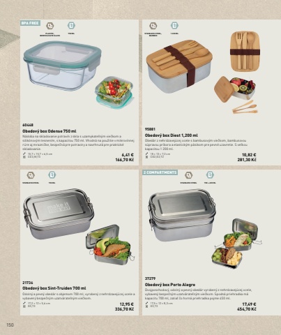 150BPA FREEPLASTIC, BOROSILICATE GLASS750 ML STAINLESS STEEL,BAMBOO1 200 MLSTAINLESS STEEL 700 ML STAINLESS STEEL 700 + 450 ML2 COMPARTMENTS95881Obedov%u00fd box Diest 1,200 mlObed%u00e1r z nehrdzavej%u00facej ocele s bambusov%u00fdm vie%u010dkom, bambusovou s%u00fapravou pr%u00edbora a elastick%u00fdm p%u00e1sikom pre pevn%u00e9 uzavretie. S ve%u013ekou kapacitou 1 200 ml.18 %u00d7 13 %u00d7 7,2 cm CG2,G2,T2 10,82 %u20ac281,30 K%u010d60448Obedov%u00fd box Odense 750 mlN%u00e1doba na skladovanie potrav%u00edn z skla s uzamykate%u013en%u00fdm vie%u010dkom a silik%u00f3nov%u00fdm tesnen%u00edm, s kapacitou 750 ml. Vhodn%u00e1 na pou%u017eitie v mikrovlnnej r%u00fare aj mrazni%u010dke, bezpe%u010dn%u00e1 pre potraviny a navrhnut%u00e1 pre praktick%u00e9 skladovanie.15,7 %u00d7 15,7 %u00d7 6,5 cm CG3,M,T3 6,41 %u20ac166,70 K%u010d21736Obedov%u00fd box Sint-Truiden 700 mlOdoln%u00fd a pevn%u00fd obed%u00e1r s objemom 700 ml, vyroben%u00fd z nehrdzavej%u00facej ocele a vybaven%u00fd bezpe%u010dn%u00fdm uzatv%u00e1rate%u013en%u00fdm vie%u010dkom.17,2 %u00d7 12 %u00d7 5,6 cm G3,T3 12,95 %u20ac336,70 K%u010d37279Obedov%u00fd box Porto AlegreDvojposchodov%u00fd, odoln%u00fd a pevn%u00fd obed%u00e1r vyroben%u00fd z nehrdzavej%u00facej ocele, vybaven%u00fd bezpe%u010dn%u00fdm uzatv%u00e1rate%u013en%u00fdm vie%u010dkom. Spodn%u00e1 priehradka m%u00e1 kapacitu 700 ml, zatia%u013e %u010do horn%u00e1 priehradka pojme 450 ml.17,5 %u00d7 12 %u00d7 8,3 cm G3,T3 17,49 %u20ac454,70 K%u010d