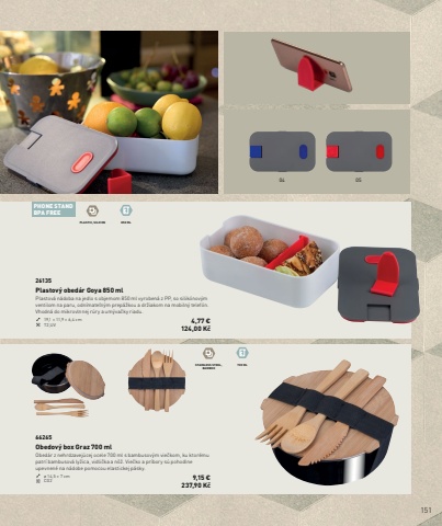 15104 05STAINLESS STEEL,BAMBOO700 MLPLASTIC, SILICON 850 MLPHONE STANDBPA FREE66265Obedov%u00fd box Graz 700 mlObed%u00e1r z nehrdzavej%u00facej ocele 700 ml s bambusov%u00fdm vie%u010dkom, ku ktor%u00e9mu patr%u00ed bambusov%u00e1 ly%u017eica, vidli%u010dka a n%u00f4%u017e. Vie%u010dko a pr%u00edbory s%u00fa pohodlne upevnen%u00e9 na n%u00e1dobe pomocou elastickej p%u00e1sky.%u00f8 14,5 %u00d7 7 cm CG2 9,15 %u20ac237,90 K%u010d26135Plastov%u00fd obed%u00e1r Goya 850 mlPlastov%u00e1 n%u00e1doba na jedlo s objemom 850 ml vyroben%u00e1 z PP, so silik%u00f3nov%u00fdm ventilom na paru, odn%u00edmate%u013en%u00fdm prep%u00e1%u017ekou a dr%u017eiakom na mobiln%u00fd telef%u00f3n. Vhodn%u00e1 do mikrovlnnej r%u00fary a um%u00fdva%u010dky riadu.19,1 %u00d7 11,9 %u00d7 6,4 cm T2,UV 4,77 %u20ac124,00 K%u010d