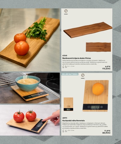 157BAMBOOBAMBOOINCLUDE BATTERIES 48573Kuchynsk%u00e1 v%u00e1ha HerentalsDigit%u00e1lna kuchynsk%u00e1 v%u00e1ha z bambusu s displejom s %u010diernym r%u00e1mom. Podporuje maxim%u00e1lnu kapacitu 5 kg a poskytuje merania v kg, g alebo oz s presnos%u0165ou na 1 gram. Ka%u017ed%u00fd kus a grav%u00edrovanie je jedine%u010dn%u00e9 v%u010faka pr%u00edrodn%u00e9mu bambusov%u00e9mu materi%u00e1lu.16,1 %u00d7 23 %u00d7 1,9 cm CG3 11,69 %u20ac303,90 K%u010d63340Bambusov%u00e1 kr%u00e1jacia doska VilniusVe%u013ek%u00e1 bambusov%u00e1 doska na kr%u00e1janie s vlnit%u00fdmi stranami. Ide%u00e1lna na serv%u00edrovanie ob%u010derstvenia a pr%u00edpravu jed%u00e1l. Ka%u017ed%u00fd kus a grav%u00edrovanie je jedine%u010dn%u00e9 v%u010faka pr%u00edrodn%u00e9mu bambusov%u00e9mu materi%u00e1lu.38 %u00d7 14,1 %u00d7 1,5 cm CG3 6,67 %u20ac173,40 K%u010d