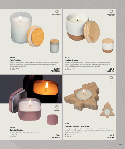 175GLASS, BAMBOO, WAXMETAL,WAXCERAMIC, BAMBOO, CORK, WAXWOOD,WAX85049Svie%u010dka MetzSvie%u010dka v elegantnom matnom skle s bambusov%u00fdm vie%u010dkom, dekorat%u00edvna a v%u0161estrann%u00e1. Ka%u017ed%u00fd kus a grav%u00edrovanie je jedine%u010dn%u00e9 v%u010faka pr%u00edrodn%u00e9mu bambusov%u00e9mu materi%u00e1lu.%u00f8 6,7 %u00d7 8 cm CG2 5,08 %u20ac 132,10 K%u010d08512Svie%u010dka BrugesSvie%u010dka v keramickej n%u00e1dobe s korkov%u00fdm dnom a bambusov%u00fdm vekom. %u0160t%u00fdlov%u00e1 a dokonal%u00e1 pre %u00fatuln%u00fa atmosf%u00e9ru. Ka%u017ed%u00fd kus a grav%u00edrovanie je jedine%u010dn%u00e9 v%u010faka pr%u00edrodn%u00e9mu bambusov%u00e9mu materi%u00e1lu.%u00f8 7,2 %u00d7 7,5 cm CG2,T2 6,33 %u20ac 164,60 K%u010d02677Viano%u010dn%u00e1 svie%u010dka ColchesterDreven%u00fd viano%u010dn%u00fd strom%u010dek so svie%u010dkou. Sl%u00e1vnostn%u00e1 a %u00fatuln%u00e1 dekor%u00e1cia na viano%u010dn%u00e9 obdobie. Ka%u017ed%u00fd kus a grav%u00edrovanie je jedine%u010dn%u00e9 v%u010faka pr%u00edrodn%u00e9mu bambusov%u00e9mu materi%u00e1lu.8,5 %u00d7 1,8 %u00d7 9 cm CG1,T2 1,62 %u20ac42,10 K%u010d18106Svie%u010dka PragueSvie%u010dka v kovovej d%u00f3ze obsahuj%u00faca 60 g vosku.5,5 %u00d7 5,5 %u00d7 4 cm G1,T2 1,79 %u20ac46,50 K%u010d