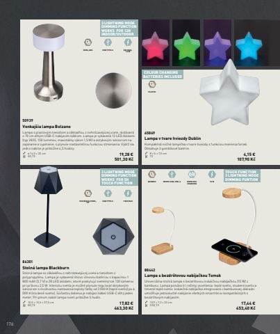 176PLASTICSTAINLESS STEEL, PPUSB TYPE-C 1 800 MAH3 LIGHTNING MODEDIMMING FUNCTIONWORKS FOR 5HTOUCH FUNCTION COLOUR CHANGINGBATTERIES INCLUDEDIRON, ABS USB TYPE-C 800 MAH, 1,5 W3 LIGHTNING MODEDIMMING FUNCTIONWORKS FOR 12HINDOOR/OUTDOORBAMBOO MICRO-USB, USB-A WIRELESSCHARGING15 WTOUCH FUNCTION3 LIGHTNING MODEDIMMING FUNTION88442Lampa s bezdr%u00f4tovou nab%u00edja%u010dkou TomskUniverz%u00e1lna stoln%u00e1 lampa s bezdr%u00f4tovou induk%u010dnou nab%u00edja%u010dkou (15 W) z bambusu. Lampa pon%u00faka tri re%u017eimy osvetlenia: tepl%u00e9 svetlo, studen%u00e9 svetlo a tlmen%u00e9 tepl%u00e9 svetlo. Induk%u010dn%u00e1 nab%u00edja%u010dka integrovan%u00e1 v bambusovej z%u00e1kladni umo%u017e%u0148uje jednoduch%u00e9 nab%u00edjanie v%u0161etk%u00fdch smartf%u00f3nov kompatibiln%u00fdch s bezdr%u00f4tov%u00fdm nab%u00edjan%u00edm.10,9 %u00d7 7,2 %u00d7 22 cm CG3,T3 17,44 %u20ac453,40 K%u010d50939Vonkaj%u0161ia lampa BolzanoLampa s plastov%u00fdm tienidlom a z%u00e1klad%u0148ou z nehrdzavej%u00facej ocele, dod%u00e1van%u00e1 s 70 cm dlh%u00fdm USB-C nab%u00edjac%u00edm k%u00e1blom. Lampa je vybaven%u00e1 12 LED di%u00f3dami (typ 2835, 150 lumenov, maxim%u00e1lny v%u00fdkon 1,5 W) a dotykov%u00fdm senzorom na zap%u00ednanie a vyp%u00ednanie, s plynule nastavite%u013enou funkciou stmievania. V%u00fddr%u017e na jedno nabitie je pribli%u017ene 4,5 hodiny.%u00f8 14,5 %u00d7 22 cm G3,T3 19,28 %u20ac501,30 K%u010d86301Stoln%u00e1 lampa BlackburnStoln%u00e1 lampa so z%u00e1klad%u0148ou z nehrdzavej%u00facej ocele a tienidlom z polypropyl%u00e9nu. Lampa je vybaven%u00e1 l%u00edtiovo-i%u00f3novou bat%u00e9riou s kapacitou 1 800 mAh (3,7 V) a 28 LED di%u00f3dami, ktor%u00e9 poskytuj%u00fa sveteln%u00fd tok 130 l%u00famenov pri pr%u00edkonu 2,5 W. Intenzitu svetla je mo%u017en%u00e9 plynule regulova%u0165 dotykov%u00fdm senzorom s mo%u017enos%u0165ou nastavenia teploty farby od 3 000 K (tepl%u00e9 svetlo) po 6 000 K (studen%u00e9 svetlo). S%u00fa%u010das%u0165ou balenia je nab%u00edjac%u00ed k%u00e1bel USB-C dlh%u00fd jeden meter. Pri plnom nabit%u00ed lampa svieti pribli%u017ene 5 hod%u00edn.10,5 %u00d7 10,5 %u00d7 37,5 cmG3,T3 17,82 %u20ac463,30 K%u010d65869Lampa v tvare hviezdy DublinKompaktn%u00e1 no%u010dn%u00e1 lampi%u010dka v tvare hviezdy s funkciou menenia farieb. Obsahuje 3 gomb%u00edkov%u00e9 bat%u00e9rie.8 %u00d7 5 %u00d7 7,5 cm T2 4,15 %u20ac107,90 K%u010d