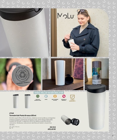 9DOUBLE-WALLED VACUUM INSULATIONRECYCLED STAINLESS STEEL 450 ML KEEP 12H WARM/24H COLDHIGH QUALITY MATERIALS 2 YEARWARRANTY67348Termohr%u010dek Ponta Grossa 450 mlHrn%u010dek na pitie MoLu Ponta Grossa, zdoben%u00fd vzorom podkovy, je elegantn%u00fd a %u0161t%u00fdlov%u00fd v%u00fdrobok z pr%u00e9miovej nerezovej ocele. Udr%u017e%u00ed n%u00e1poje tepl%u00e9 alebo studen%u00e9 a%u017e 18 hod%u00edn. S objemom 450 ml je ide%u00e1lny na pou%u017eitie po%u010das cestovania. Dod%u00e1van%u00fd v exkluz%u00edvnom dar%u010dekovom balen%u00ed s dvojro%u010dnou z%u00e1rukou.%u00f8 7,8 %u00d7 19,6 cm G3 25,13 %u20ac653,40 K%u010d