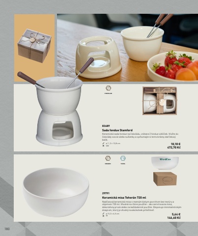 180PORCELAINCERAMIC 720 ML83689Sada fondue StamfordKeramick%u00e1 sada fondue na %u010dokol%u00e1du, vr%u00e1tane 2 fondue vidli%u010diek. Vlo%u017ete do %u010dokol%u00e1dy ovocie alebo su%u0161ienky a vychutnajte si tento kr%u00e1sny dar%u010dekov%u00fd bal%u00edk.%u00f8 11,3 %u00d7 13,8 cm VM 18,18 %u20ac472,70 K%u010d29791Keramick%u00e1 misa Teher%u00e1n 720 mlNad%u010dasov%u00e1 keramick%u00e1 misa s matn%u00fdm bielym povrchom bez text%u00fary a objemom 720 ml. Vhodn%u00e1 na r%u00f4zne pou%u017eitie %u2013 ako serv%u00edrovacia misa, dekorat%u00edvny prvok alebo na ka%u017edodenn%u00e9 pou%u017eitie. Disponuje minimalistick%u00fdm dizajnom, ktor%u00fd je vhodn%u00fd na ak%u00fako%u013evek pr%u00edle%u017eitos%u0165.%u00f8 15,3 %u00d7 6,5 cm M 5,64 %u20ac146,60 K%u010d