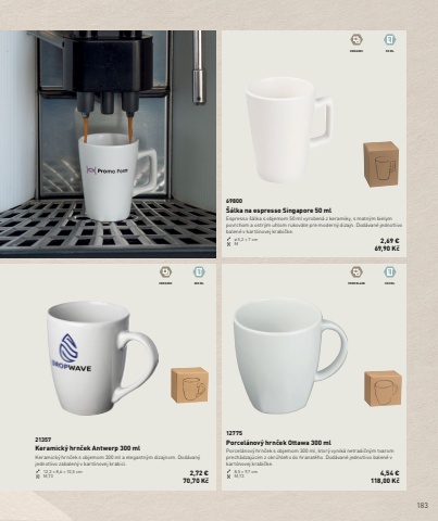 183CERAMIC 50 MLCERAMIC 300 ML PORCELAIN 300 ML12775Porcel%u00e1nov%u00fd hrn%u010dek Ottawa 300 mlPorcel%u00e1nov%u00fd hrn%u010dek s objemom 300 ml, ktor%u00fd vynik%u00e1 netradi%u010dn%u00fdm tvarom prech%u00e1dzaj%u00facim z okr%u00fahleho do hranat%u00e9ho. Dod%u00e1van%u00e9 jednotlivo balen%u00e9 v kart%u00f3novej krabi%u010dke.8,5 %u00d7 9,7 cm M,T3 4,54 %u20ac118,00 K%u010d21357Keramick%u00fd hrn%u010dek Antwerp 300 mlKeramick%u00fd hrn%u010dek s objemom 300 ml a elegantn%u00fdm dizajnom. Dod%u00e1van%u00fd jednotlivo zabalen%u00fd v kart%u00f3novej krabici.12,3 %u00d7 8,6 %u00d7 10,5 cm M,T3 2,72 %u20ac70,70 K%u010d69800%u0160%u00e1lka na espresso Singapore 50 mlEspresso %u0161%u00e1lka s objemom 50 ml vyroben%u00e1 z keramiky, s matn%u00fdm bielym povrchom a ostr%u00fdm uhlom rukov%u00e4te pre modern%u00fd dizajn. Dod%u00e1van%u00e9 jednotlivo balen%u00e9 v kart%u00f3novej krabi%u010dke.%u00f8 5,2 %u00d7 7 cm M 2,69 %u20ac69,90 K%u010d