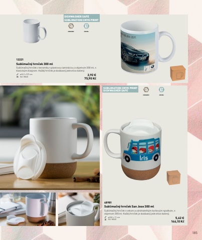 185DISHWASHER SAFESUBLIMATION CMYK PRINT SUBLIMATION CMYK PRINT DISHWASHER SAFECERAMIC 300 MLCERAMIC 300 ML12221Sublima%u010dn%u00fd hrn%u010dek 300 mlSublima%u010dn%u00fd hrn%u010dek z keramiky s plastovou lamin%u00e1ciou a objemom 300 ml, s klasick%u00fdm dizajnom. Ka%u017ed%u00fd hrn%u010dek je dod%u00e1van%u00fd jednotlivo balen%u00fd.%u00f8 8,2 %u00d7 9,9 cm SU-MUG 2,92 %u20ac75,90 K%u010d48981Sublima%u010dn%u00fd hrn%u010dek San Jose 300 mlSublima%u010dn%u00fd hrn%u010dek s vekom a odn%u00edmate%u013en%u00fdm korkov%u00fdm spodkom, s objemom 300 ml. Ka%u017ed%u00fd hrn%u010dek je dod%u00e1van%u00fd jednotlivo balen%u00fd.%u00f8 8,8 %u00d7 11 cm SU-MUG 5,62 %u20ac146,10 K%u010d