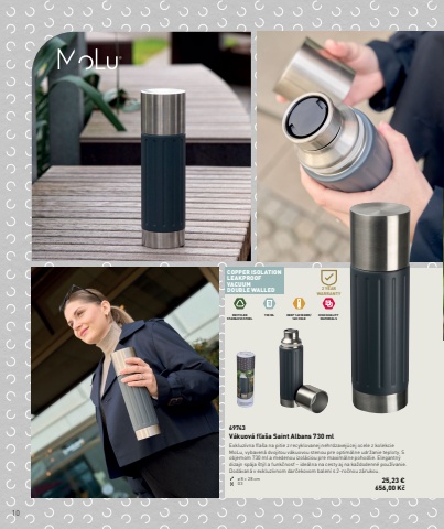 10COPPER ISOLATIONLEAKPROOFVACUUMDOUBLE WALLED RECYCLED STAINLESS STEEL730 ML KEEP 14H WARM/16H COLDHIGH QUALITY MATERIALS2 YEARWARRANTY69743V%u00e1kuov%u00e1 f%u013ea%u0161a Saint Albans 730 mlExkluz%u00edvna f%u013ea%u0161a na pitie z recyklovanej nehrdzavej%u00facej ocele z kolekcie MoLu, vybaven%u00e1 dvojitou v%u00e1kuovou stenou pre optim%u00e1lne udr%u017eanie teploty. S objemom 730 ml a medenou izol%u00e1ciou pre maxim%u00e1lne pohodlie. Elegantn%u00fd dizajn sp%u00e1ja %u0161t%u00fdl a funk%u010dnos%u0165 %u2013 ide%u00e1lna na cesty aj na ka%u017edodenn%u00e9 pou%u017e%u00edvanie. Dod%u00e1van%u00e1 v exkluz%u00edvnom dar%u010dekovom balen%u00ed s 2-ro%u010dnou z%u00e1rukou.%u00f8 8 %u00d7 28 cm G3 25,23 %u20ac 656,00 K%u010d