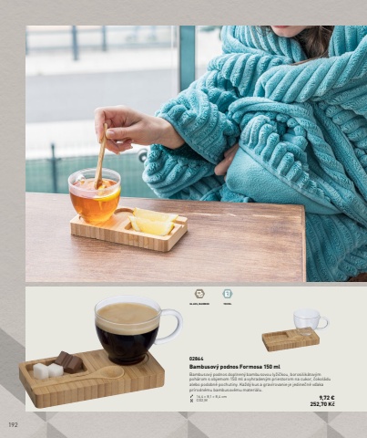 192GLASS, BAMBOO 150 ML02864Bambusov%u00fd podnos Formosa 150 mlBambusov%u00fd podnos doplnen%u00fd bambusovou ly%u017ei%u010dkou, borosilik%u00e1tov%u00fdm poh%u00e1rom s objemom 150 ml a vyhraden%u00fdm priestorom na cukor, %u010dokol%u00e1du alebo podobn%u00e9 pochutiny. Ka%u017ed%u00fd kus a grav%u00edrovanie je jedine%u010dn%u00e9 v%u010faka pr%u00edrodn%u00e9mu bambusov%u00e9mu materi%u00e1lu.16,4 %u00d7 8,1 %u00d7 8,4 cm CG2,M 9,72 %u20ac252,70 K%u010d