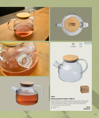 195GLASS, BAMBOO 1 000 MLSTRAINER92863Sklenen%u00fd %u010dajn%u00edk Frankfurt 1000 mlSklenen%u00fd d%u017eb%u00e1n s uzatv%u00e1rate%u013en%u00fdm bambusov%u00fdm vie%u010dkom a integrovan%u00fdm sitkom na nalievanie, s objemom 1 000 ml. Dod%u00e1van%u00fd jednotlivo balen%u00fd v kart%u00f3novej krabi%u010dke. Ka%u017ed%u00fd kus a grav%u00edrovanie je jedine%u010dn%u00e9 v%u010faka pr%u00edrodn%u00e9mu bambusov%u00e9mu materi%u00e1lu.%u00f8 13 %u00d7 12,5 cm CG3,M 9,74 %u20ac253,20 K%u010d