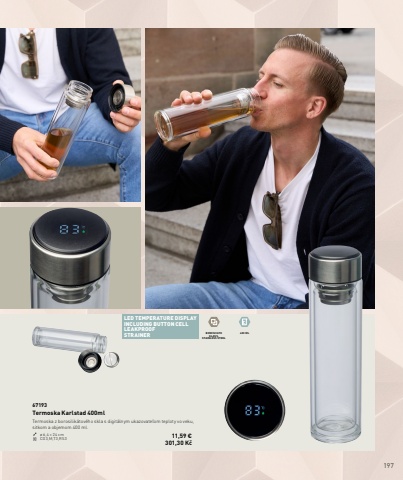 197LED TEMPERATURE DISPLAYINCLUDING BUTTON CELLLEAKPROOFSTRAINER BOROSICATEGLASS, STAINLESS STEEL400 ML67193Termoska Karlstad 400mlTermoska z borosilik%u00e1tov%u00e9ho skla s digit%u00e1lnym ukazovate%u013eom teploty vo veku, sitkom a objemom 400 ml.%u00f8 6,4 %u00d7 24 cm CG3,M,T3,RS3 11,59 %u20ac301,30 K%u010d
