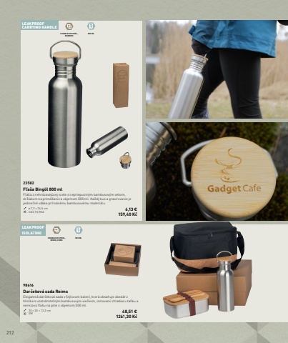 212LEAKPROOFISOLATINGSTAINLESS STEEL,BAMBOO800 MLSTAINLESS STEEL,WOOD, CORK500 MLLEAKPROOFCARRYING HANDLE98616Dar%u010dekov%u00e1 sada ReimsElegantn%u00e1 dar%u010dekov%u00e1 sada v %u0161t%u00fdlovom balen%u00ed, ktor%u00e1 obsahuje obed%u00e1r z hlin%u00edka s uzatv%u00e1rate%u013en%u00fdm bambusov%u00fdm vie%u010dkom, izolovan%u00fa chladiacu ta%u0161ku a nerezov%u00fa f%u013ea%u0161u na pitie s objemom 500 ml.30 %u00d7 30 %u00d7 13,2 cm VM 48,51 %u20ac1261,30 K%u010d23582F%u013ea%u0161a Bing%u00f6l 800 mlF%u013ea%u0161a z nehrdzavej%u00facej ocele s nepriepustn%u00fdm bambusov%u00fdm vekom, dr%u017eiakom na pren%u00e1%u0161anie a objemom 800 ml. Ka%u017ed%u00fd kus a grav%u00edrovanie je jedine%u010dn%u00e9 v%u010faka pr%u00edrodn%u00e9mu bambusov%u00e9mu materi%u00e1lu.%u00f8 7,2 %u00d7 24,5 cm CG2,T3,RS2 6,13 %u20ac159,40 K%u010d