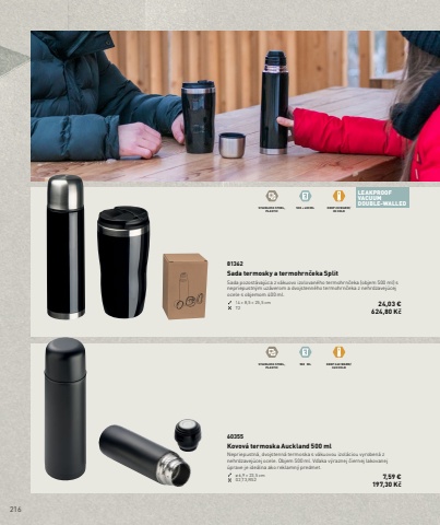 216LEAKPROOFVACUUMDOUBLE-WALLED STAINLESS STEEL, PLASTIC500 + 400 ML KEEP 2H WARM/3H COLDSTAINLESS STEEL, PLASTIC500 ML KEEP 24H WARM/36H COLD81362Sada termosky a termohrn%u010deka SplitSada pozost%u00e1vaj%u00faca z v%u00e1kuovo izolovan%u00e9ho termohrn%u010deka (objem 500 ml) s nepriepustn%u00fdm uz%u00e1verom a dvojstenn%u00e9ho termohrn%u010deka z nehrdzavej%u00facej ocele s objemom 400 ml.14 %u00d7 8,5 %u00d7 25,5 cm T2 24,03 %u20ac 624,80 K%u010d60355Kovov%u00e1 termoska Auckland 500 mlNepriepustn%u00e1, dvojstenn%u00e1 termoska s v%u00e1kuovou izol%u00e1ciou vyroben%u00e1 z nehrdzavej%u00facej ocele. Objem 500 ml. V%u010faka v%u00fdraznej %u010diernej lakovanej %u00faprave je ide%u00e1lna ako reklamn%u00fd predmet.%u00f8 6,9 %u00d7 23,5 cm G2,T3,RS2 7,59 %u20ac197,30 K%u010d