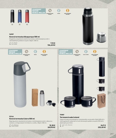 217 03 04 05LEAKPROOFVACUUMDOUBLE-WALLEDLEAKPROOFVACUUMDOUBLE-WALLEDLEAKPROOFVACUUMDOUBLE-WALLEDSTAINLESS STEEL, PLASTIC500 ML KEEP 24H WARM/ 36H COLDSTAINLESS STEEL, PLASTIC500 ML KEEP 24H WARM/ 36H COLDSTAINLESS STEEL, PLASTIC400+3 %u00d7120 ML KEEP 24H WARM/ 36H COLD52146Kovov%u00e1 termoska Calera 500 mlNepriepustn%u00e1, dvojstenn%u00e1 termoska z nehrdzavej%u00facej ocele s v%u00e1kuovou izol%u00e1ciou a integrovan%u00fdm hrn%u010dekom vo vie%u010dku. Objem: 500 ml.%u00f8 7 %u00d7 25,2 cm G2,M,T3,RS2 10,38 %u20ac269,90 K%u010d96907Kovov%u00e1 termoska Albuquerque 500 mlElegantn%u00e1, dvojstenn%u00e1 izola%u010dn%u00e1 termoska z nehrdzavej%u00facej ocele s odn%u00edmate%u013en%u00fdm poh%u00e1rom na pitie. Objem: 500 ml.%u00f8 7 %u00d7 24 cm G2,T3,RS2 7,10 %u20ac184,60 K%u010d75987Termosov%u00e1 sada IcelandSada termosky pozost%u00e1vaj%u00faca z dvojstenn%u00e9ho nerezov%u00e9ho f%u013ea%u0161e (400 ml) s r%u00fdchloup%u00ednac%u00edm uz%u00e1verom a troch nerezov%u00fdch poh%u00e1rov na pitie (120 ml) s plastov%u00fdm povrchom.13,2 %u00d7 6,5 %u00d7 24,6 cm G2 8,67 %u20ac225,40 K%u010d