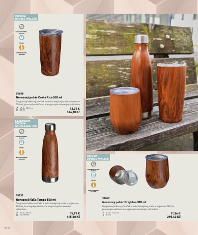 218VACUUM DOUBLE-WALLEDLEAKPROOFVACUUM DOUBLE-WALLEDVACUUM DOUBLE-WALLEDSTAINLESS STEEL, PLASTIC380 MLKEEP 4H WARM/ 6H COLDSTAINLESS STEEL, PLASTIC500 MLKEEP 24H WARM/ 36H COLDSTAINLESS STEEL, PLASTIC550 MLKEEP 8H WARM/ 12H COLD18235Nerezov%u00e1 f%u013ea%u0161a Tampa 500 mlDvojstenn%u00e1 v%u00e1kuov%u00e1 f%u013ea%u0161a z nehrdzavej%u00facej ocele s objemom 500 ml, ktor%u00e1 sp%u00e1ja odolnos%u0165 s elegantn%u00fdm dreven%u00fdm vzh%u013eadom.%u00f8 7,5 %u00d7 26 cm G2,T3,RS2 15,97 %u20ac415,20 K%u010d05680Nerezov%u00fd poh%u00e1r Costa Rica 550 mlDvojstenn%u00fd v%u00e1kuov%u00fd hrn%u010dek z nehrdzavej%u00facej ocele s objemom 550 ml, plastov%u00fdm vie%u010dkom a elegantn%u00fdm dreven%u00fdm vzh%u013eadom.%u00f8 9,5 %u00d7 18,3 cm G2,T3 13,31 %u20ac346,10 K%u010d32069Nerezov%u00fd poh%u00e1r Brighton 380 mlDvojstenn%u00fd v%u00e1kuov%u00fd hrn%u010dek z nehrdzavej%u00facej ocele s objemom 380 ml, plastov%u00fdm vie%u010dkom a elegantn%u00fdm dreven%u00fdm vzh%u013eadom.%u00f8 7,7 %u00d7 11,5 cm G2,T3 11,36 %u20ac295,40 K%u010d