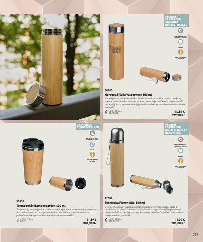 219VACUUMLEAKPROOFSTRAINER DOUBLE-WALLEDVACUUMLEAKPROOF DOUBLE-WALLEDHAND WRISTDRIP PROOF DOUBLE-WALLEDSTAINLESS STEEL, BAMBOO, PLASTIC500 MLKEEP 24H WARM/ 36H COLDSTAINLESS STEEL, BAMBOO, PLASTIC400 MLKEEP 2H WARM/ 3H COLDSTAINLESS STEEL, BAMBOO, PLASTIC550 MLKEEP 24H WARM/ 36H COLD22007Termoska Florenville 500 mlDvojstenn%u00e1 v%u00e1kuovo izolovan%u00e1 f%u013ea%u0161a na pitie z nehrdzavej%u00facej ocele s poh%u00e1rikom na pitie, p%u00fatkom na ruku, bambusov%u00fdm vonkaj%u0161%u00edm po%u0165ahom a objemom 500 ml. Ka%u017ed%u00fd kus a grav%u00edrovanie je jedine%u010dn%u00e9 v%u010faka pr%u00edrodn%u00e9mu bambusov%u00e9mu materi%u00e1lu.%u00f8 6,4 %u00d7 27,3 cm CG2,T3,RS2 11,00 %u20ac286,00 K%u010d08803Nerezov%u00e1 f%u013ea%u0161a Valdemoro 550 mlNepriepustn%u00e1, dvojstenn%u00e1 v%u00e1kuovo izolovan%u00e1 termoska z nehrdzavej%u00facej ocele s bambusov%u00fdm obalom, sitkom, nerezov%u00fdm vie%u010dkom a objemom 550 ml. Ka%u017ed%u00fd kus a grav%u00edrovanie je jedine%u010dn%u00e9 v%u010faka pr%u00edrodn%u00e9mu bambusov%u00e9mu materi%u00e1lu.%u00f8 6,8 %u00d7 20,5 cm G3,T3,RS2 14,51 %u20ac377,30 K%u010d30435Termopoh%u00e1r Bamboogarden 400 mlDvojstenn%u00fd cestovn%u00fd poh%u00e1r z nehrdzavej%u00facej ocele s bambusov%u00fdm povrchom, tesnou kon%u0161trukciou a objemom 400 ml. Ka%u017ed%u00fd kus a grav%u00edrovanie je jedine%u010dn%u00e9 v%u010faka pr%u00edrodn%u00e9mu bambusov%u00e9mu materi%u00e1lu.%u00f8 7,8 %u00d7 17,6 cm G3,T2 11,59 %u20ac301,30 K%u010d