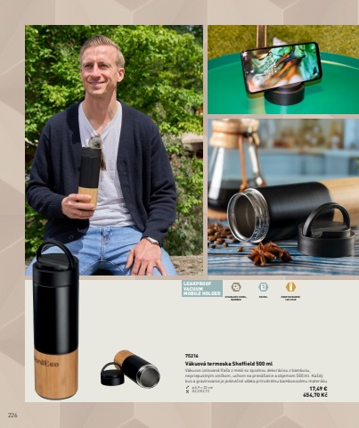 226LEAKPROOFVACUUMMOBILE HOLDER STAINLESS STEEL, BAMBOO500 ML KEEP 8H WARM/ 12H COLD75216V%u00e1kuov%u00e1 termoska Sheffield 500 mlV%u00e1kuovo izolovan%u00e1 f%u013ea%u0161a z medi so spodnou dekor%u00e1ciou z bambusu, nepriepustn%u00fdm vie%u010dkom, uchom na pren%u00e1%u0161anie a objemom 500 ml. Ka%u017ed%u00fd kus a grav%u00edrovanie je jedine%u010dn%u00e9 v%u010faka pr%u00edrodn%u00e9mu bambusov%u00e9mu materi%u00e1lu.%u00f8 6,9 %u00d7 22 cm G2,CG2,T3 17,49 %u20ac454,70 K%u010d