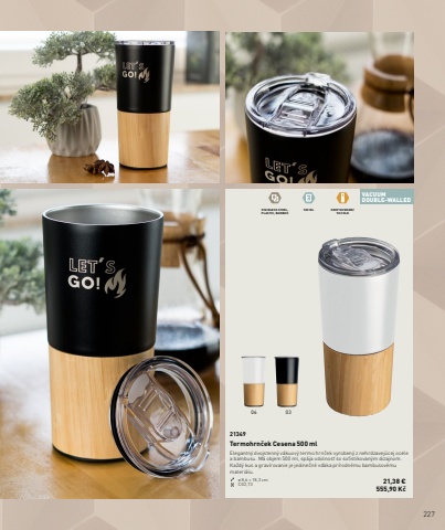 22706 03VACUUMDOUBLE-WALLEDSTAINLESS STEEL, PLASTIC, BAMBOO500 ML KEEP 8H WARM/ 9H COLD21349Termohrn%u010dek Cesena 500 mlElegantn%u00fd dvojstenn%u00fd v%u00e1kuov%u00fd termo hrn%u010dek vyroben%u00fd z nehrdzavej%u00facej ocele a bambusu. M%u00e1 objem 500 ml, sp%u00e1ja odolnos%u0165 so sofistikovan%u00fdm dizajnom. Ka%u017ed%u00fd kus a grav%u00edrovanie je jedine%u010dn%u00e9 v%u010faka pr%u00edrodn%u00e9mu bambusov%u00e9mu materi%u00e1lu.%u00f8 8,6 %u00d7 18,3 cm CG2,T3 21,38 %u20ac555,90 K%u010d