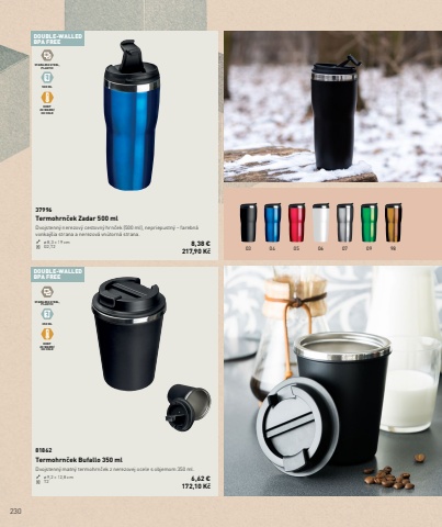 23003 04 05 06 07 09 98DOUBLE-WALLEDBPA FREEDOUBLE-WALLEDBPA FREESTAINLESS STEEL,PLASTIC500 MLKEEP2H WARM/3H COLDSTAINLESS STEEL,PLASTIC350 MLKEEP2H WARM/3H COLD81862Termohrn%u010dek Bufallo 350 mlDvojstenn%u00fd matn%u00fd termohrn%u010dek z nerezovej ocele s objemom 350 ml.%u00f8 9,2 %u00d7 12,8 cm T2 6,62 %u20ac172,10 K%u010d37996Termohrn%u010dek Zadar 500 mlDvojstenn%u00fd nerezov%u00fd cestovn%u00fd hrn%u010dek (500 ml), nepriepustn%u00fd %u2013 farebn%u00e1 vonkaj%u0161ia strana a nerezov%u00e1 vn%u00fatorn%u00e1 strana.%u00f8 8,3 %u00d7 19 cm G2,T2 8,38 %u20ac217,90 K%u010d