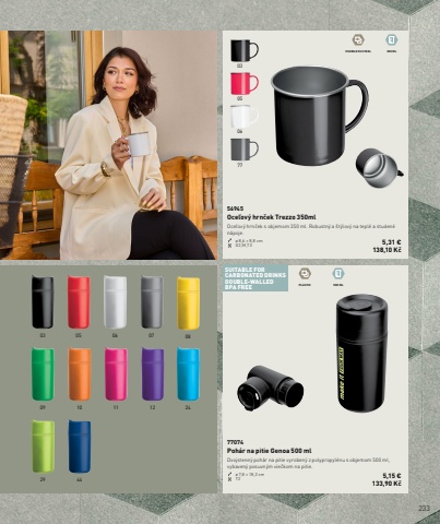 2337706050329 4409 10 11 12 2403 05 06 07 08SUITABLE FOR CARBONATED DRINKSDOUBLE-WALLEDBPA FREE PLASTIC 500 MLSTAINLESS STEEL 350 ML56945Oce%u013eov%u00fd hrn%u010dek Trezzo 350mlOce%u013eov%u00fd hrn%u010dek s objemom 350 ml. Robustn%u00fd a %u0161t%u00fdlov%u00fd na tepl%u00e9 a studen%u00e9 n%u00e1poje.%u00f8 8,6 %u00d7 8,8 cm G2,M,T3 5,31 %u20ac138,10 K%u010d77074Poh%u00e1r na pitie Genoa 500 mlDvojstenn%u00fd poh%u00e1r na pitie vyroben%u00fd z polypropyl%u00e9nu s objemom 500 ml, vybaven%u00fd posuvn%u00fdm vie%u010dkom na pitie.%u00f8 7,8 %u00d7 18,2 cm T2 5,15 %u20ac133,90 K%u010d