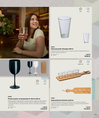 23503 06GLASS 300 MLBAMBOO, GLASS 4X3 CLBPA FREEPLASTIC 450 ML87514Sklenen%u00fd poh%u00e1r Shanghai 300 mlElegantn%u00fd sklenen%u00fd poh%u00e1r na pitie s objemom 300 ml. Dod%u00e1van%u00e9 jednotlivo balen%u00e9 v kart%u00f3novej krabi%u010dke.%u00f8 8 %u00d7 12,3 cm CG3,M 3,03 %u20ac 78,80 K%u010d53150Plastov%u00fd poh%u00e1r na %u0161ampansk%u00e9 St. Moritz 450 mlPlastov%u00fd poh%u00e1r na %u0161ampansk%u00e9 s objemom 450 ml. Ide%u00e1lne na pl%u00e1%u017e, z%u00e1hradu a baz%u00e9nov%u00e9 p%u00e1rty, tieto poh%u00e1re s%u00fa nevyhnutn%u00e9 pre bezpe%u010dnos%u0165. Vyroben%u00e9 z odoln%u00e9ho PS plastu, pon%u00fakaj%u00fa kapacitu 450 ml a pom%u00e1haj%u00fa predch%u00e1dza%u0165 zraneniam.%u00f8 8,5 %u00d7 22 cm T3,RS1 4,82 %u20ac 125,30 K%u010d61904Sada poh%u00e1rikov Kufstein 4x30 ml5-dielna sada poldec%u00e1kov so 4 poh%u00e1rmi po 3 cl a drevenou doskou s popruhom na ruku na pren%u00e1%u0161anie. Ka%u017ed%u00fd kus a grav%u00edrovanie je jedine%u010dn%u00e9 v%u010faka pr%u00edrodn%u00e9mu bambusov%u00e9mu materi%u00e1lu.33 %u00d7 8 %u00d7 6 cm CG3,M 7,46 %u20ac194,00 K%u010d