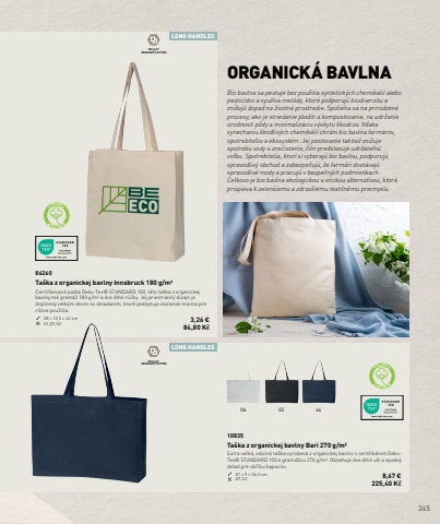 24506 03 44ORGANICCOT TO NORGANICCOT TO NLONG HANDLESLONG HANDLES270 g/m2 ORGANIC COTTON180 g/m2 ORGANIC COTTON10835Ta%u0161ka z organickej bavlny Bari 270 g/m%u00b2Extra ve%u013ek%u00e1, odoln%u00e1 ta%u0161ka vyroben%u00e1 z organickej bavlny s certifik%u00e1tom OekoTex%u00ae STANDARD 100 a gram%u00e1%u017eou 270 g/m%u00b2. Obsahuje dve dlh%u00e9 u%u0161i a spodn%u00fd sklad pre v%u00e4%u010d%u0161iu kapacitu.57 %u00d7 9 %u00d7 36,5 cm DT,S2 8,67 %u20ac225,40 K%u010d86260Ta%u0161ka z organickej bavlny Innsbruck 180 g/m%u00b2Certifikovan%u00e1 pod%u013ea Oeko-Tex%u00ae STANDARD 100, t%u00e1to ta%u0161ka z organickej bavlny m%u00e1 gram%u00e1%u017e 180 g/m%u00b2 a dve dlh%u00e9 r%u00fa%u010dky. Jej priestrann%u00fd dizajn je doplnen%u00fd ve%u013ek%u00fdm dnom so skladan%u00edm, ktor%u00e9 poskytuje dostatok miesta pre r%u00f4zne pou%u017eitia.38 %u00d7 10,5 %u00d7 42 cm S1,DT,S2 3,26 %u20ac 84,80 K%u010dORGANICK%u00c1 BAVLNABio bavlna sa pestuje bez pou%u017eitia syntetick%u00fdch chemik%u00e1li%u00ed alebo pestic%u00eddov a vyu%u017e%u00edva met%u00f3dy, ktor%u00e9 podporuj%u00fa biodiverzitu a zni%u017euj%u00fa dopad na %u017eivotn%u00e9 prostredie. Spolieha sa na prirodzen%u00e9 procesy, ako je striedanie plod%u00edn a kompostovanie, na udr%u017eanie %u00farodnosti p%u00f4dy a minimaliz%u00e1ciu v%u00fdskytu %u0161kodcov. V%u010faka vynechaniu %u0161kodliv%u00fdch chemik%u00e1li%u00ed chr%u00e1ni bio bavlna farm%u00e1rov, spotrebite%u013eov a ekosyst%u00e9m. Jej pestovanie taktie%u017e zni%u017euje spotrebu vody a zne%u010distenie, %u010d%u00edm predstavuje udr%u017eate%u013en%u00fa vo%u013ebu. Spotrebitelia, ktor%u00ed si vyberaj%u00fa bio bavlnu, podporuj%u00fa spravodliv%u00fd obchod a zabezpe%u010duj%u00fa, %u017ee farm%u00e1ri dost%u00e1vaj%u00fa spravodliv%u00e9 mzdy a pracuj%u00fa v bezpe%u010dn%u00fdch podmienkach. Celkovo je bio bavlna ekologickou a etickou alternat%u00edvou, ktor%u00e1 prispieva k zelen%u0161iemu a zdrav%u0161iemu textiln%u00e9mu priemyslu.
