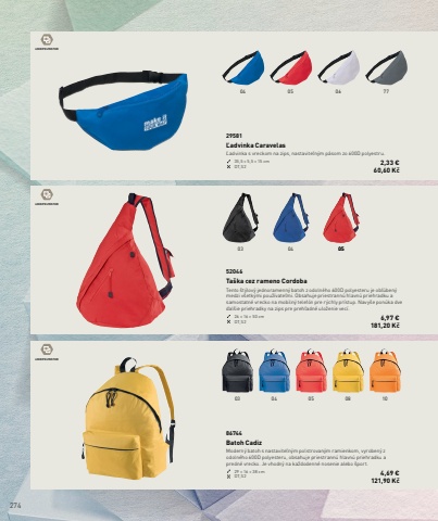 27404 05 06 7703 04 0503 04 05 08 10600D POLYESTER600D POLYESTER600D POLYESTER29581%u013dadvinka Caravelas%u013dadvinka s vreckom na zips, nastavite%u013en%u00fdm p%u00e1som zo 600D polyestru.35,5 %u00d7 5,5 %u00d7 15 cm DT,S2 2,33 %u20ac 60,60 K%u010d86744Batoh CadizModern%u00fd batoh s nastavite%u013en%u00fdm polstrovan%u00fdm ramienkom, vyroben%u00fd z odoln%u00e9ho 600D polyesteru, obsahuje priestrann%u00fa hlavn%u00fa priehradku a predn%u00e9 vrecko. Je vhodn%u00fd na ka%u017edodenn%u00e9 nosenie alebo %u0161port.29 %u00d7 16 %u00d7 38 cm DT,S2 4,69 %u20ac121,90 K%u010d52046Ta%u0161ka cez rameno CordobaTento %u0161t%u00fdlov%u00fd jednoramenn%u00fd batoh z odoln%u00e9ho 600D polyesteru je ob%u013e%u00faben%u00fd medzi v%u0161etk%u00fdmi pou%u017e%u00edvate%u013emi. Obsahuje priestrann%u00fa hlavn%u00fa priehradku a samostatn%u00e9 vrecko na mobiln%u00fd telef%u00f3n pre r%u00fdchly pr%u00edstup. Navy%u0161e pon%u00faka dve %u010fal%u0161ie priehradky na zips pre preh%u013eadn%u00e9 ulo%u017eenie vec%u00ed.26 %u00d7 16 %u00d7 50 cm DT,S2 6,97 %u20ac181,20 K%u010d
