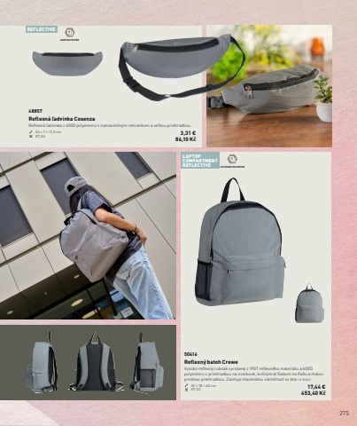 275REFLECTIVELAPTOP COMPARTMENTREFLECTIVE600D POLYESTER190T/600D POLYESTER48857Reflexn%u00e1 %u013eadvinka CosenzaReflexn%u00e1 %u013eadvinka z 600D polyesteru s nastavite%u013en%u00fdm remienkom a ve%u013ekou priehradkou.34 %u00d7 7 %u00d7 12,5 cm DT,S2 3,31 %u20ac86,10 K%u010d50416Reflexn%u00fd batoh CreweVysoko reflexn%u00fd ruksak vyroben%u00fd z 190T reflexn%u00e9ho materi%u00e1lu a 600D polyesteru s priehradkou na notebook, bo%u010dn%u00fdm dr%u017eiakom na f%u013ea%u0161u a malou prednou priehradkou. Zais%u0165uje maxim%u00e1lnu vidite%u013enos%u0165 vo dne i v noci.32 %u00d7 18 %u00d7 40 cm DT,S2 17,44 %u20ac453,40 K%u010d
