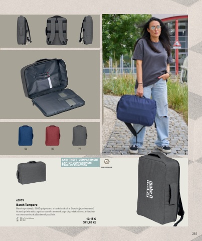 28104 05 77ANTI-THEFT COMPARTMENTLAPTOP COMPARTMENTTROLLEY FUNCTION 300D POLYESTER45979Batoh TampereBatoh vyroben%u00fd z 300D polyesteru s funkciou kufra. Obsahuje priestrann%u00fa hlavn%u00fa priehradku a polstrovan%u00e9 ramenn%u00e9 popruhy, v%u010faka %u010domu je ide%u00e1lny na cestovanie a ka%u017edodenn%u00e9 pou%u017eitie.30 %u00d7 14 %u00d7 44 cm DT,S2 13,15 %u20ac341,90 K%u010d