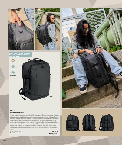 282ANTI-THEFT COMPARTMENTLAPTOP COMPARTMENTWATERPROOF300D POLYESTERUSB-A PORTEXPANDABLE03729Batoh RichmondVysoko kvalitn%u00fd batoh vyroben%u00fd z 300D polyesteru. Tento nepremokav%u00fd batoh m%u00e1 viacero priehradiek: priehradku na notebook s uz%u00e1verom a dodato%u010dn%u00fdm vreckom, bezpe%u010dnostn%u00e9 vrecko na zadnej strane, bo%u010dn%u00e9 vrecko so sie%u0165ovanou vlo%u017ekou a roztiahnute%u013en%u00fdm zipsom, priehradku na pr%u00e1dlo v spodnej %u010dasti, polstrovan%u00e9 vrecko na prednej strane, a predn%u00e9 bo%u010dn%u00e9 vrecko na zips, r%u00f4zne vn%u00fatorn%u00e9 vreck%u00e1. Okrem toho obsahuje USB port s k%u00e1blom, dve rukov%u00e4te na pren%u00e1%u0161anie, popruh na voz%u00edk, polstrovan%u00e9 ramenn%u00e9 popruhy, polstrovan%u00fd chrb%u00e1t a zips na roz%u0161%u00edrenie batohu. Perfektn%u00fd spolo%u010dn%u00edk nielen na slu%u017eobn%u00e9 cesty.30 %u00d7 29 %u00d7 47 cm DT,S2 52,28 %u20ac 1359,30 K%u010d