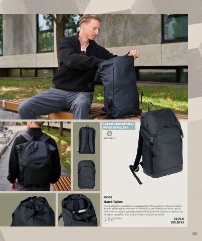 283LAPTOP COMPARTMENTWATER REPELLENTPOLYESTER, PU86330Batoh TallinnVe%u013ek%u00fd polyesterov%u00fd batoh s vodoodpudiv%u00fdm PU povrchom. M%u00e1 priestrann%u00fa hlavn%u00fa priehradku s vreckom na notebook a vystu%u017een%u00fdm chrbtom, ako aj dve vreck%u00e1 na zips na pravej a %u013eavej vonkaj%u0161ej strane. Uzatv%u00e1ra sa pomocou %u0161n%u00farky a chlop%u0148ou, ktor%u00e1 udr%u017e%u00ed obsah such%u00fd po%u010das da%u017e%u010fa.30 %u00d7 16 %u00d7 50 cm DT,S2 20,74 %u20ac539,20 K%u010d