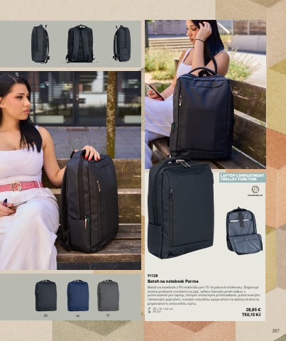 28703 44 77LAPTOP COMPARTMENTTROLLEY FUNCTIONPOLYESTER, PU91128Batoh na notebook ParmaBatoh na notebook z PU materi%u00e1lu pre 15-16 palcov%u00e9 notebooky. Disponuje dvoma predn%u00fdmi vreckami na zips, ve%u013ekou hlavn%u00fdm priehradkou s polstrovan%u00edm pre laptop, r%u00f4znymi vn%u00fatorn%u00fdmi priehradkami, polstrovan%u00fdmi ramenn%u00fdmi popruhmi, nosn%u00fdm rukov%u00e4%u0165ou a popruhom na zadnej strane na pripevnenie k cestovn%u00e9mu kufru.30 %u00d7 16 %u00d7 44 cm DT,S2 28,85 %u20ac 750,10 K%u010d