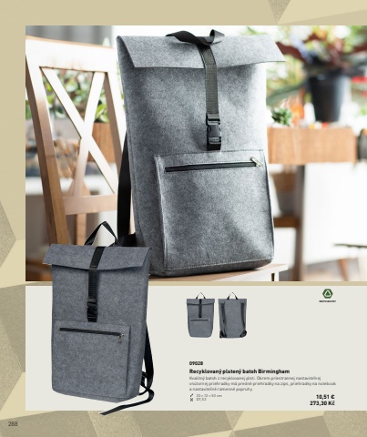 288RECYCLED PET09028Recyklovan%u00fd plsten%u00fd batoh BirminghamKvalitn%u00fd batoh z recyklovanej plsti. Okrem priestrannej nastavite%u013enej vn%u00fatornej priehradky m%u00e1 predn%u00e9 priehradky na zips, priehradky na notebook a nastavite%u013en%u00e9 ramenn%u00e9 popruhy.33 %u00d7 12 %u00d7 53 cm DT,S2 10,51 %u20ac273,30 K%u010d